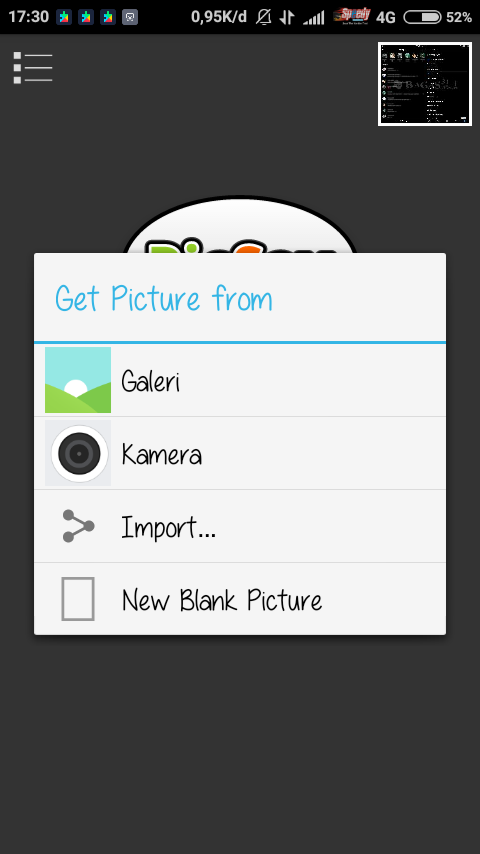 Kalau sobat belum punya aplikasi ini, sobat bisa download di PlayStore atau Google. Setelah masuk aplikasi PicSay Pro, silahkan tekan "Get Picture". Lalu tekan new picture dan buat sizenya 100×100. Usahakan backgroundnya transparan ya sobat.